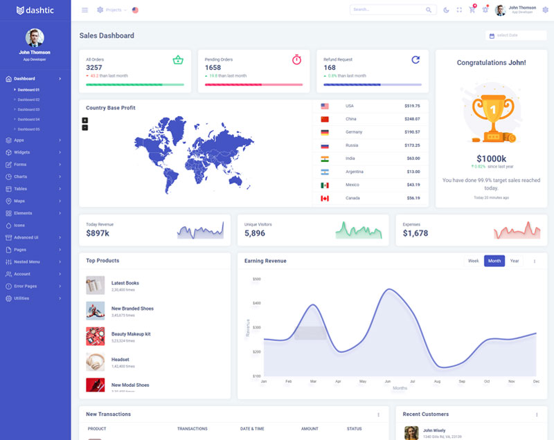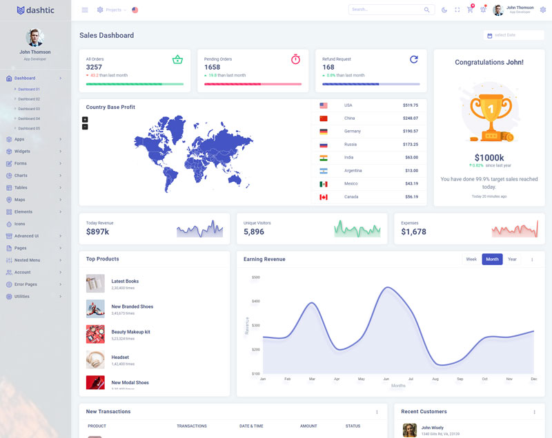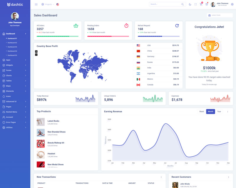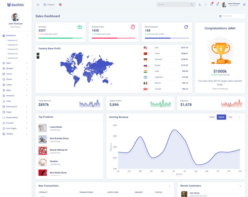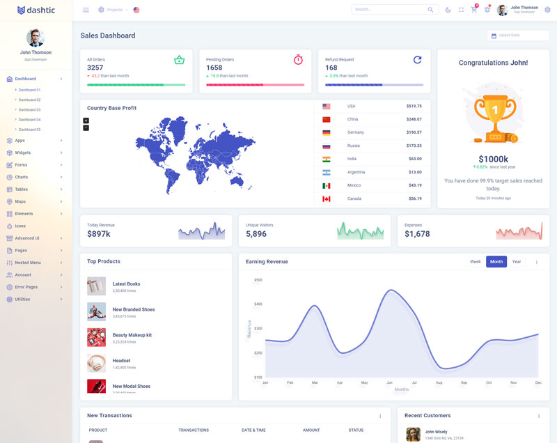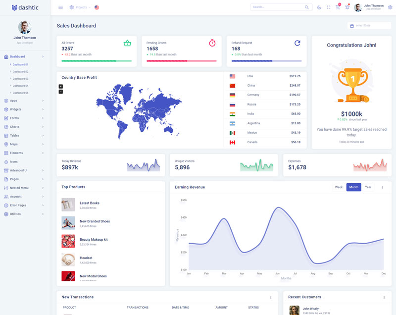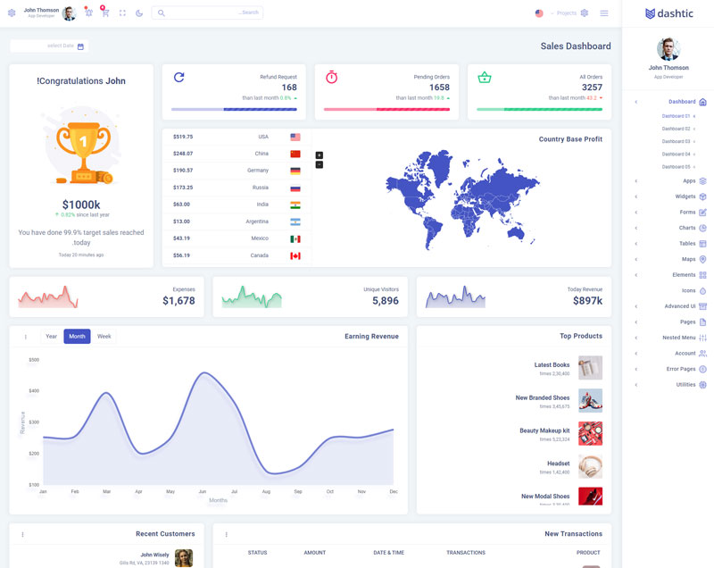 The Dashtic Dashboard Template comes with a wealth of ready-to-use features, saving developers significant time with its array of pre-built functionalities.